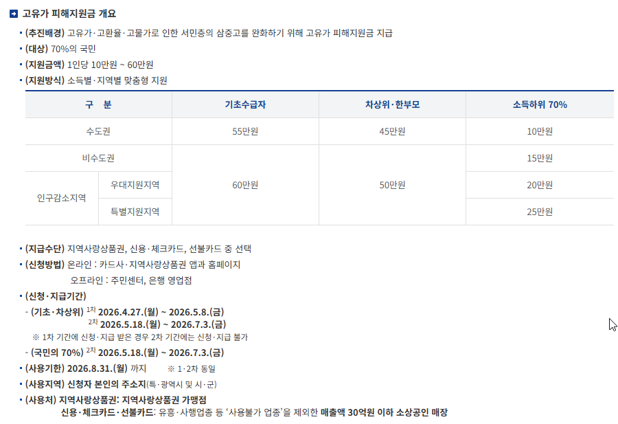 경제야 놀자! 고유가 피해 지원금 신청 방법 2026년 04월 22일2026년 04월 22일 미르연 출처 : 행정안전부 고유가 피해 지원금 안내 바로가기 KB 국민카드 : 고유가 피해 지원금 신청 바로가기 신한카드 : 고유가 피해 지원금 신청 바로가기 Related Posts 경제야 놀자! 한미 관세 협상 타결, ‘15%’ 아래 숨은 경제의 그림자 2025년 08월 01일2025년 08월 01일 미르연 경제야 놀자! 민생회복 소비쿠폰 적립 후 사용법 총정리: 결제수단별 안내 및 꿀팁 2025년 07월 23일2025년 07월 23일 미르연